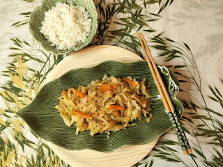 Hace unos días fui a mi frutería (ya sabéis, Frutería El Parque, en Badajoz) y me topé una col tan hermosa como esta. De su propia cosecha y a un precio realmente económico. Lo que cunde una col, ¡por Dios! Con un cuarto de esta col he preparado este plato estilo oriental y me han salido cuatro raciones.